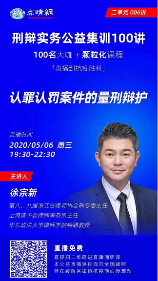2020年5月6日晚19:30,我所主任徐宗新律师受点睛网邀请,为学员们直播讲授《认罪认罚案件的量刑辩护》。