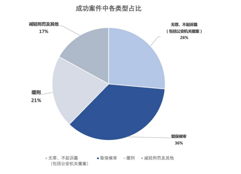 - 2021年靖予霖天津所办理各类刑事案件成功数量共计106件,其中无罪、不起诉(包括公安机关撤案)案件28件,具体为无罪案件1件,不起诉案件16件,公安机关撤案9件,公安机关撤回审查起诉案2件,占当年总成功案件比例为26%;取保候审案件38件,占当年总成功案件比例为36%;缓刑案件22件,占当年总成功案件比例为21%;减刑及其他案件18件,占当年总成功案件比例为17%。